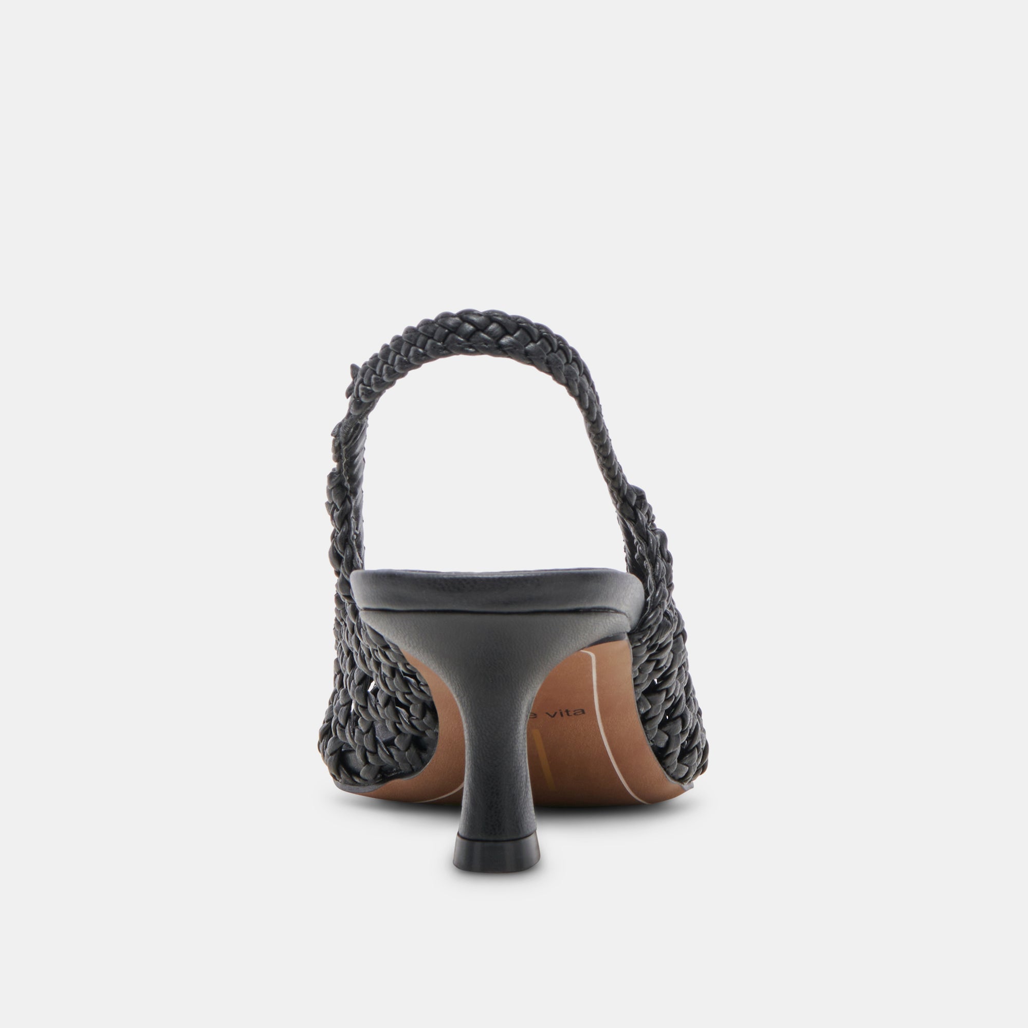OLYMPA has that timeless vintage look. This sling-back with a kitten heel features an all over braided design in white, black, or gold metallic.
